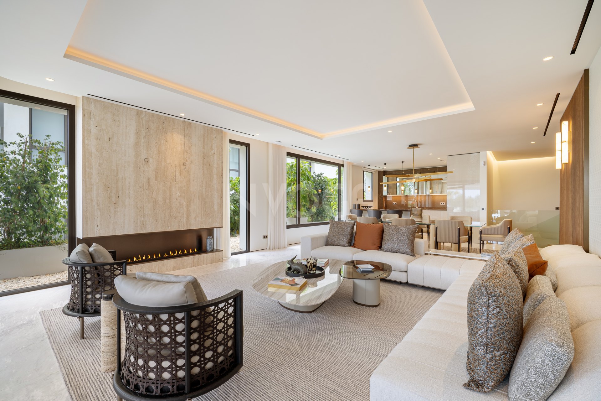 Upon entering, the property opens into an elegant open-plan living space combining lounge, dining area and a sleek designer kitchen, all flooded with natural light through floor-to-ceiling windows offering open views of the Mediterranean Sea and La Concha mountain. The living area flows seamlessly onto a spectacular terrace featuring multiple outdoor zones, a fully equipped outdoor kitchen and a heated lounge area. Three en-suite bedrooms are located on this level. The lower floor, with independent access from the garage, hosts two additional bedrooms and an impressive entertainment lounge with home cinema, ensuring privacy and comfort throughout.