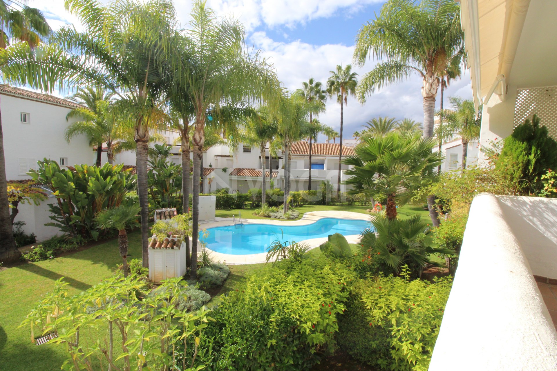 Very spacious semi-detached house with Mediterranean style and private garden in a gated complex on the seafront in Bahía de Marbella, Marbella East. On the principal floor the house offers a kitchen, guest toilet, living and dining room and terrace with spectacular views of the community gardens, swimming pools and the sea. The ground floor offers three bedrooms with two bathrooms and access to the garden, the pool and communal areas, the first floor offers a double bedroom with a full bathroom and an additional terrace. The house is decorated in a pleasant Mediterranean style and has a parking space in the underground garage. It has several golf courses within 10 minutes by car. And the center of Marbella is a 5 minute drive away! Not for rent in August.